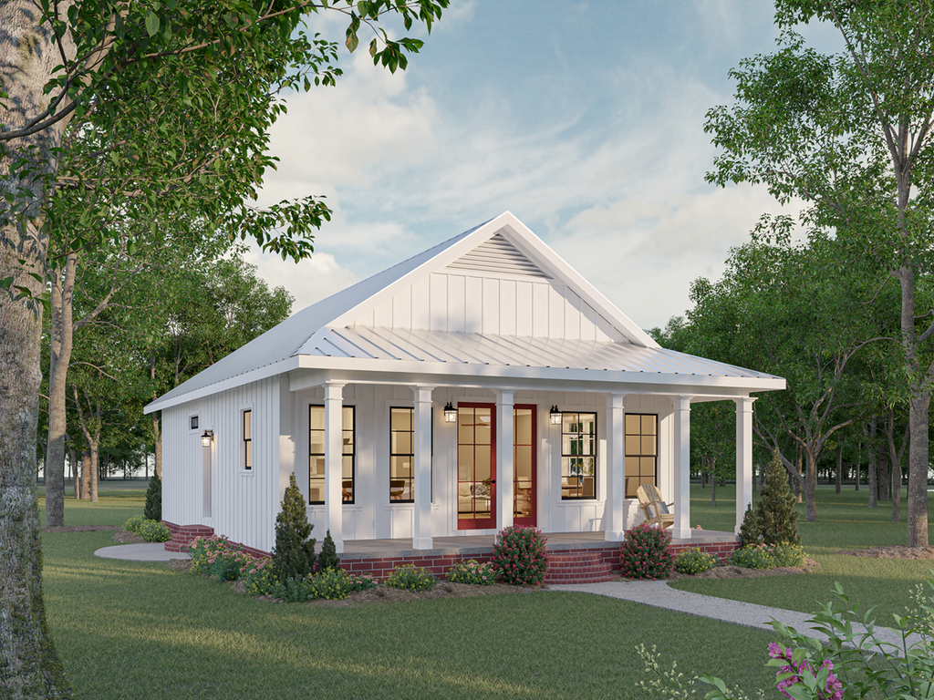 White modern cottage with a porch, surrounded by green lawn and trees, under a partly cloudy sky.